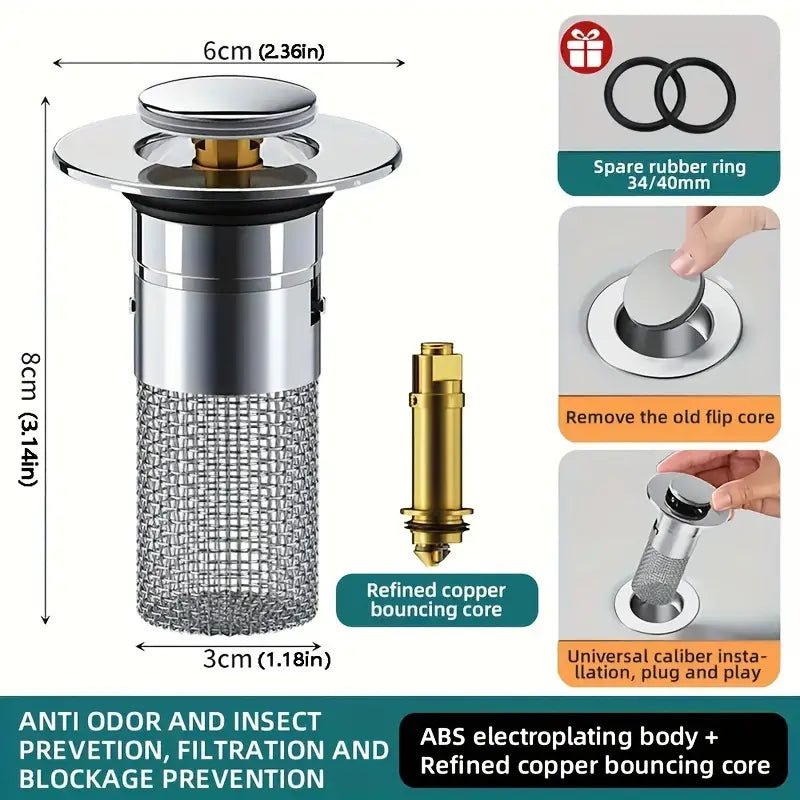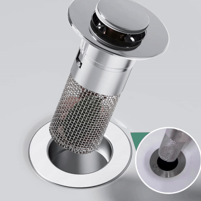 Wir präsentieren unseren Edelstahl-Bodenablauffilter und Waschbeckenverschluss. Entwickelt, um Ihre Abflüsse frei von Verstopfungen und Gerüchen zu halten, fungiert dieser aufspringende Waschbeckenverschluss auch als Haarfänger und Duschabfluss-Sieb. Mit dieser effizienten und langlebigen Lösung für Ihr Badezimmer sagen Sie Verstopfungen und unangenehmen Gerüchen Lebewohl.