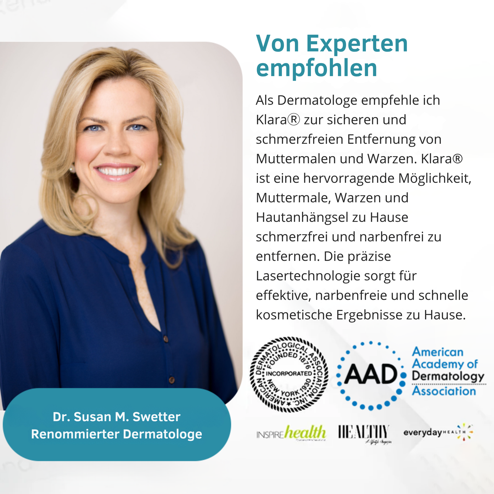 „Ich habe viele Warzen im Gesicht – das macht mich sehr unsicher. Besonders unangenehm ist es, wenn Leute unbewusst darauf starren. Ich wollte eigentlich zu einem Dermatologen gehen, aber das hätte zu viel Zeit und Geld gekostet. In der ersten Woche mit Klara war die Haut um die Warzen etwas juckend, aber ich konnte deutlich sehen, wie die Warzen dunkler und trockener wurden. Nach sieben Tagen begann sich die Haut zu schälen und die Warzen fielen vollständig ab. Ich habe das Produkt zwei Wochen lang jeden Tag eine halbe Minute benutzt – die Warzen sind jetzt komplett verschwunden! Ich muss mir keine Sorgen mehr machen, andere anzustecken. Es sind erst ein paar Wochen vergangen seitdem sie abgefallen sind, und ich bin sehr zufrieden mit dem Ergebnis. Probieren Sie es aus – Sie sparen viel Geld für Arztbesuche!“ - Olivia Garcia, Los Angeles